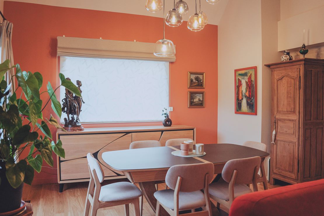 Dans la salle à manger, un mur terracotta affirme le caractère de la pièce. Il dialogue avec le mobilier contemporain en chêne massif clair signé Mobilier de France : table rectangulaire aux bords arrondis, enfilade à portes coplanaires avec éclairage LED intégré et chaises en chêne et cuir beige. Les touches de noir viennent structurer l’ensemble avec élégance.