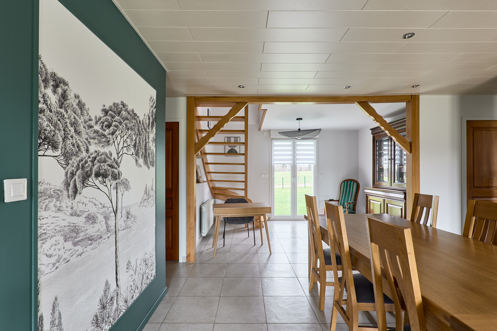 Dans le salon, la cheminée a été remise au goût du jour pour servir de point repère. Autour, les lignes restent sobres afin de laisser respirer l’ensemble. Côté salle à manger, un mur vert apporte une touche forte. Par ailleurs, le papier peint panoramique Isidore Leroy donne du relief et attire le regard. Résultat : chaque zone existe clairement, tout en gardant une belle continuité.