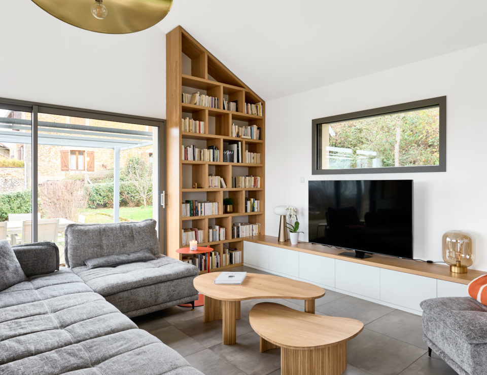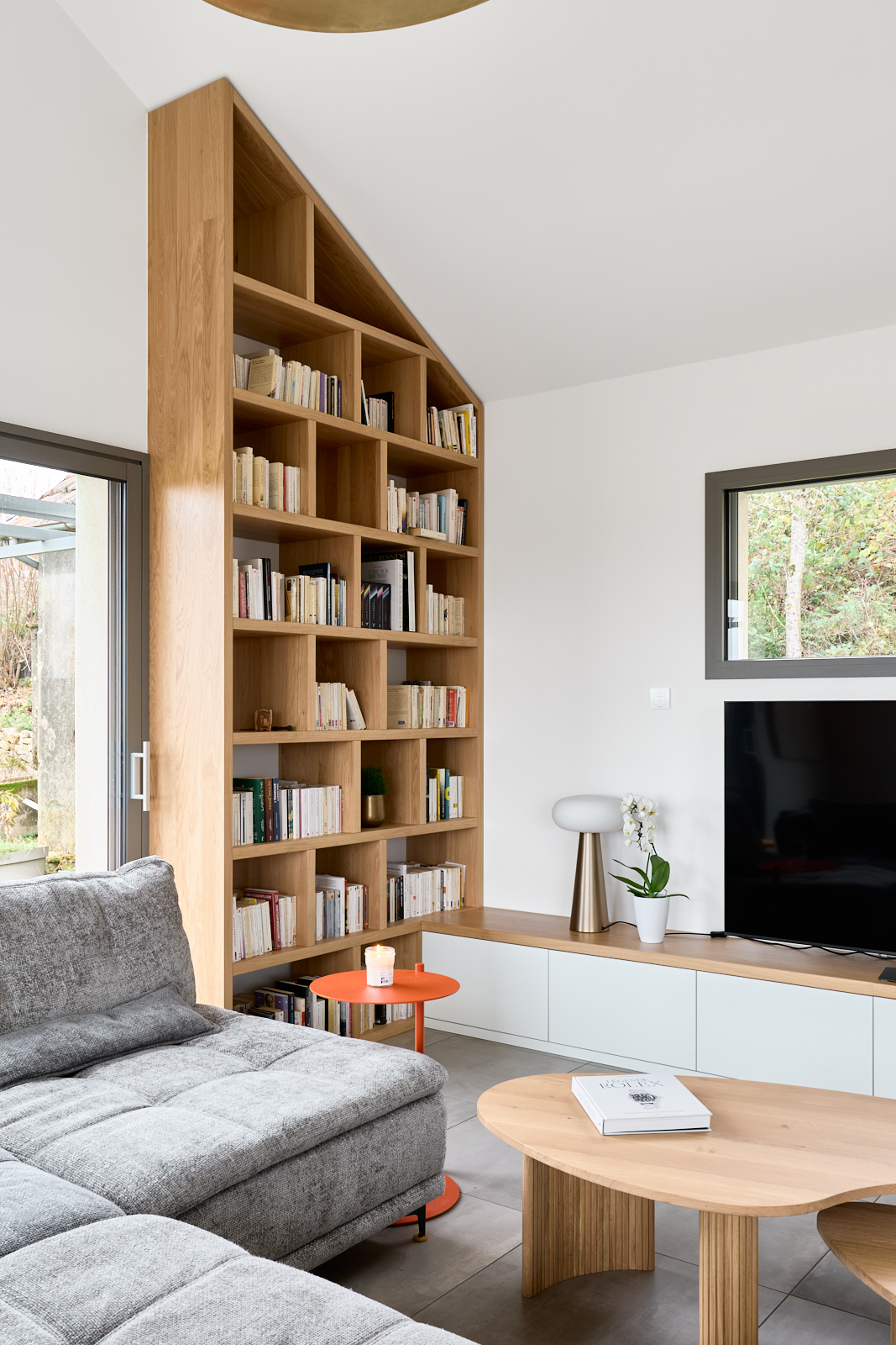 Le salon s’organise autour d’une bibliothèque sur mesure qui structure la pièce tout en intégrant la télévision et des rangements. Le bois clair et les assises confortables créent une ambiance contemporaine et conviviale. Les tables basses en bois, les touches colorées et la lumière naturelle renforcent la douceur de l’ensemble.