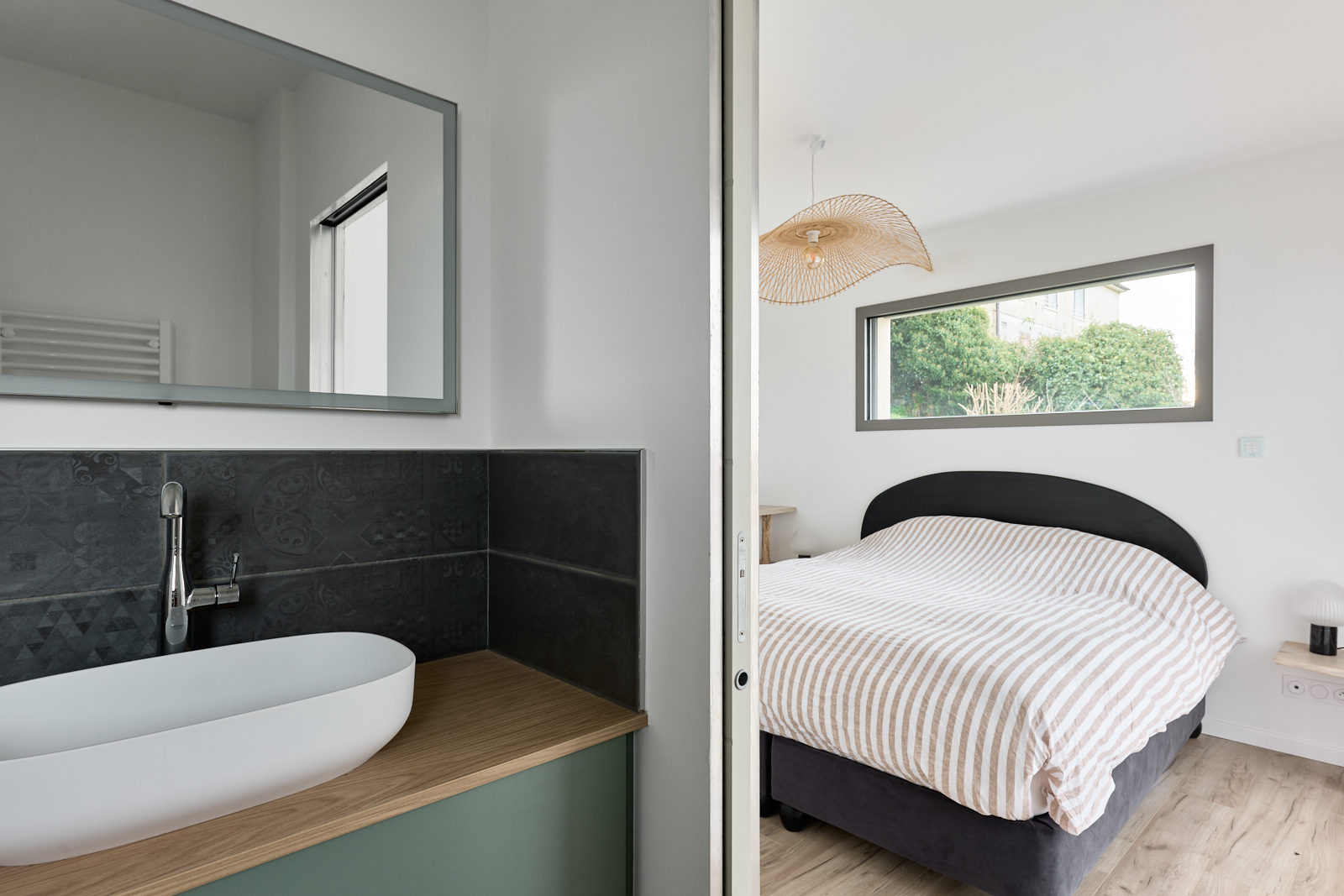 La cuisine existante a été modernisée grâce à une nouvelle crédence, des luminaires raffinés et un coffrage qui unifie l’ensemble. Le couloir et l’escalier adoptent des teintes plus chaudes, créant une transition fluide entre les pièces. La salle de bain offre désormais un meuble vasque contemporain, un miroir sobre et une paroi de douche qui allège l’espace.