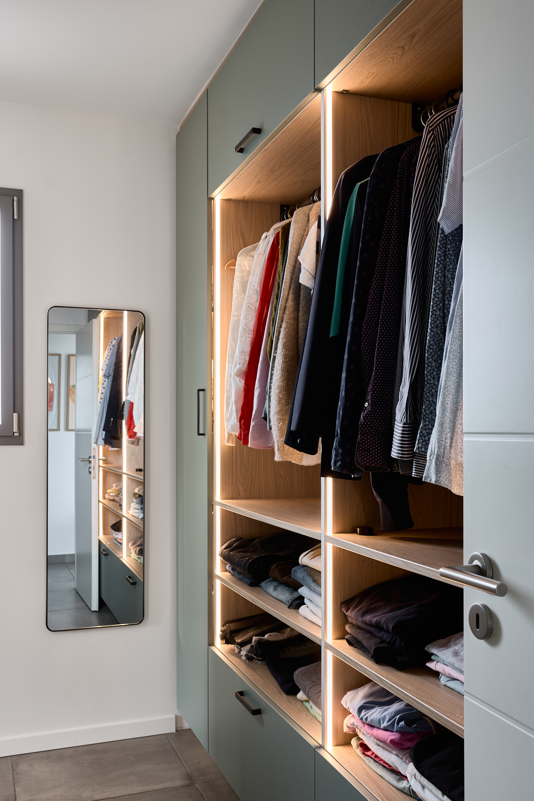 La palette repose sur des tons naturels et lumineux. Dans la chambre, le papier peint panoramique apporte une atmosphère apaisante. La tête de lit, les luminaires et le mobilier léger accentuent cette sensation de calme. Le dressing sur mesure, accompagné d’un éclairage intégré, optimise chaque zone avec élégance et discrétion.