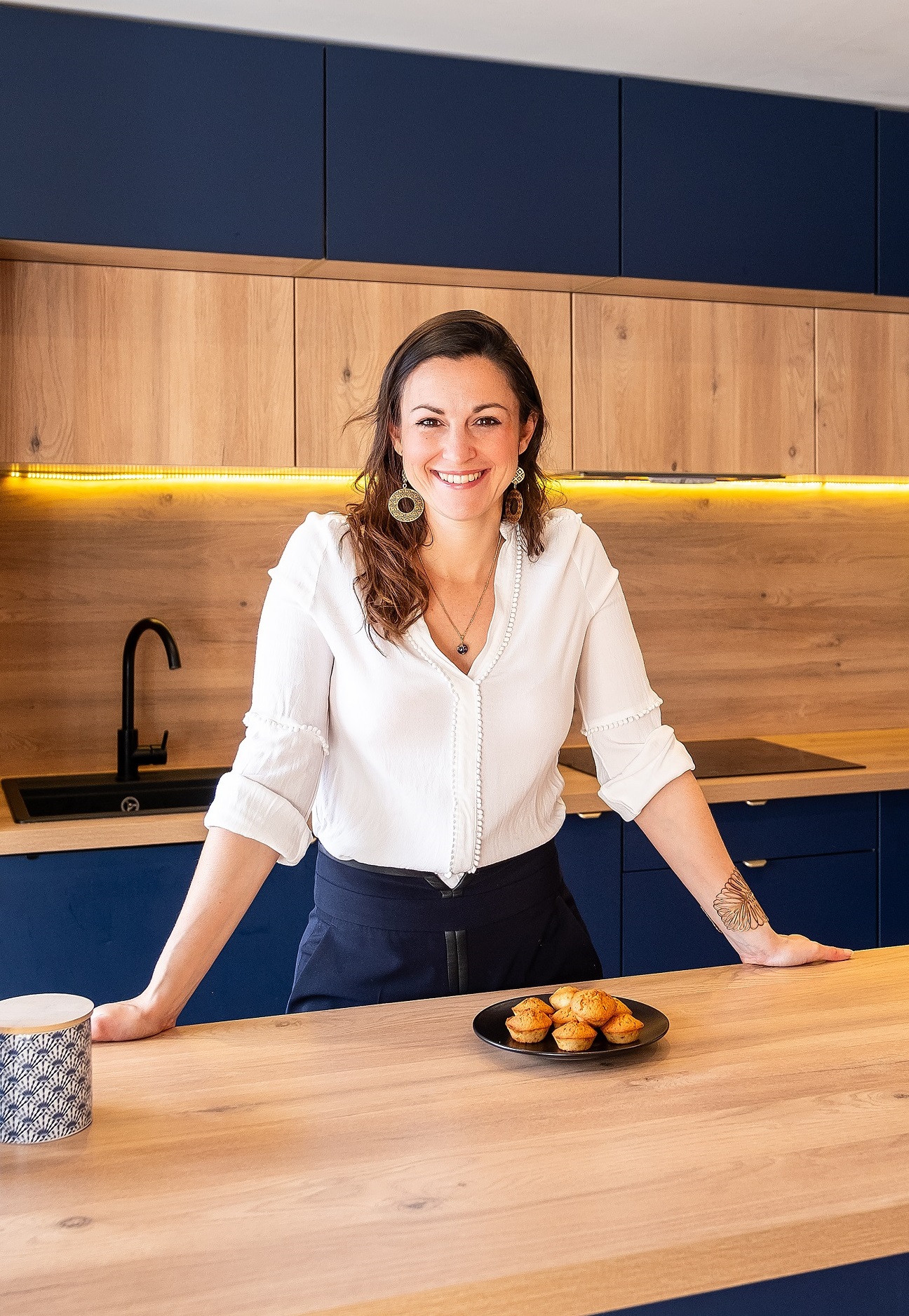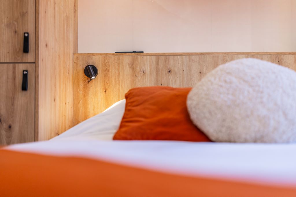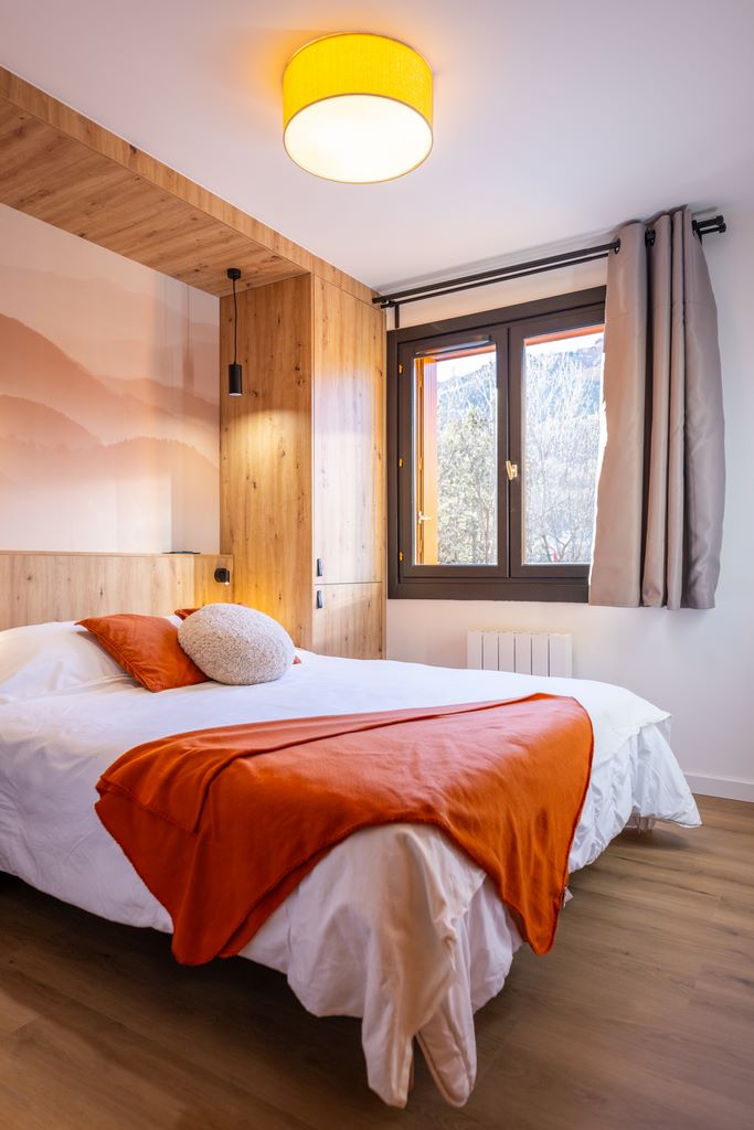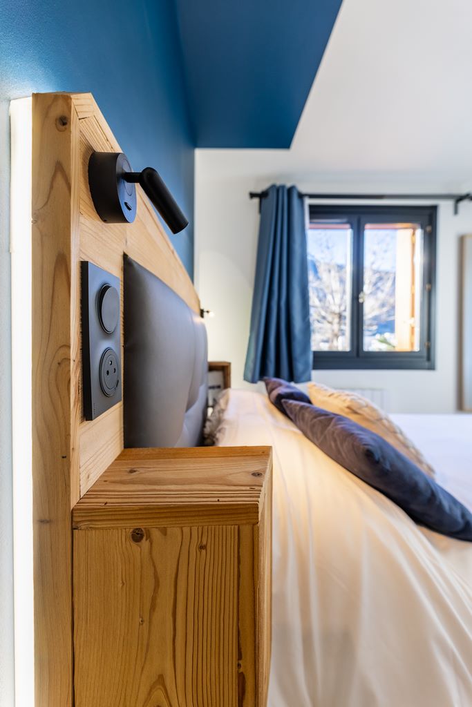 Dans la chambre principale, un pont de lit sur mesure relie deux colonnes de rangement. Cette structure optimise l’espace tout en créant une alcôve intime. Les teintes terracotta et bois clair apportent douceur et élégance. Quant à la chambre bleue, elle revisite l’ambiance montagne avec un jeu de peinture bleu roi et un encadrement en bois thermobrossé. L’ensemble intègre liseuses, prises et bandeau LED rétroéclairé. Chaque détail a été pensé pour marier esthétique et praticité.
