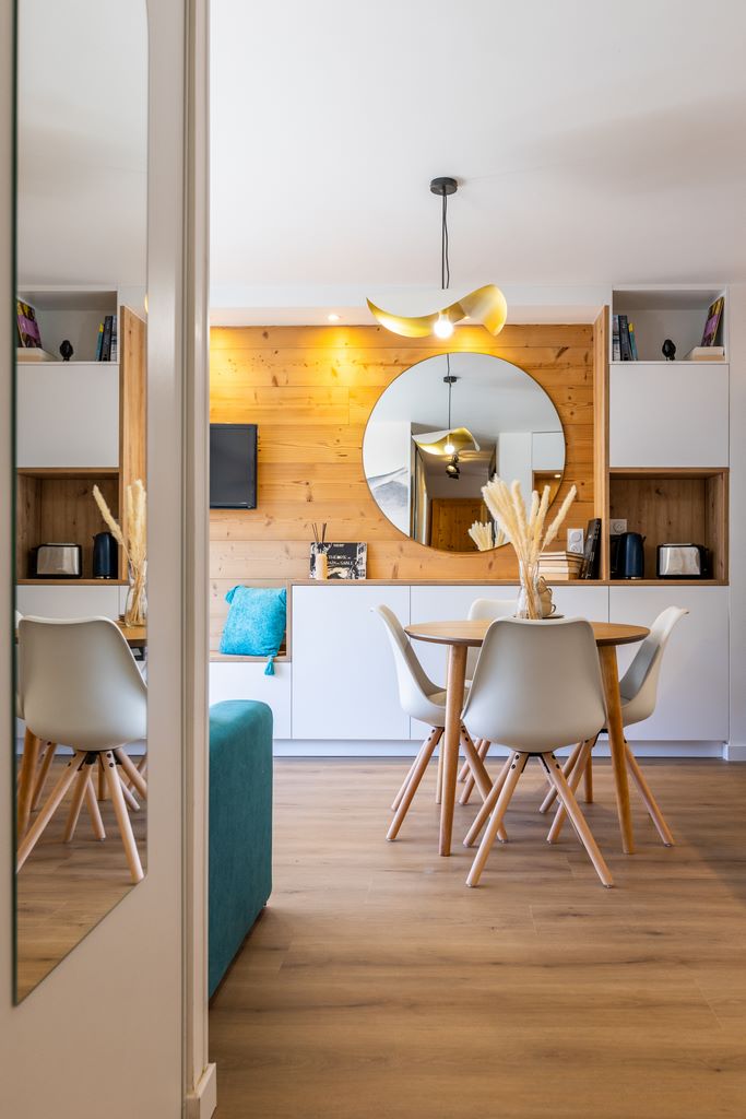 Ce projet de 50m², propriété d’un CSE, a été entièrement repensé avec un budget de 70 000 €. L’objectif était clair : moderniser les espaces, optimiser les rangements et créer un ensemble cohérent. Malgré la contrainte de conserver certains éléments existants – canapé turquoise, frigo gris, lave-vaisselle et tête de lit en sky – l’équipe a su transformer l’appartement en un lieu chaleureux et fonctionnel. Le résultat reflète parfaitement l’esthétique montagne contemporaine, chère à MH INTERIOR.