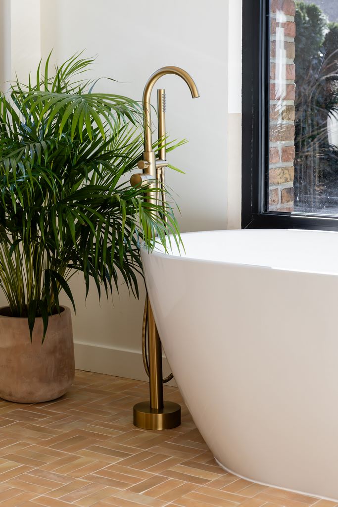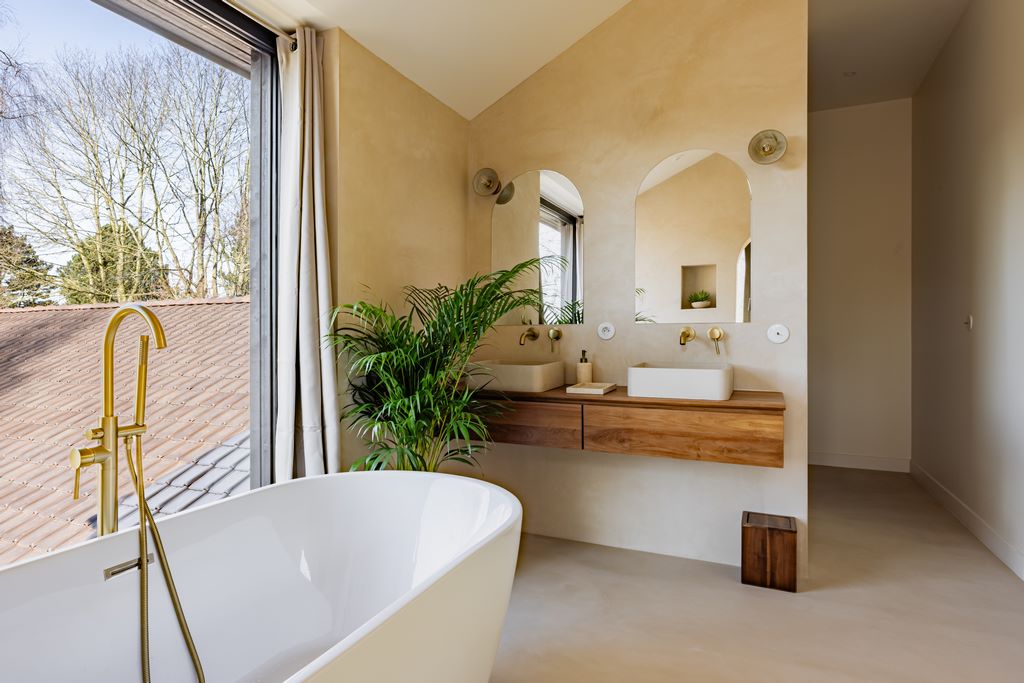 La salle de bain parentale, habillée de mortex, séduit par sa texture minérale et son ambiance apaisante. Une baignoire îlot orientée vers la fenêtre invite à la détente, tandis qu’un double meuble vasque suspendu en chêne et une robinetterie en laiton brossé apportent élégance et authenticité. Les plantes vertes complètent cette atmosphère naturelle et équilibrée.