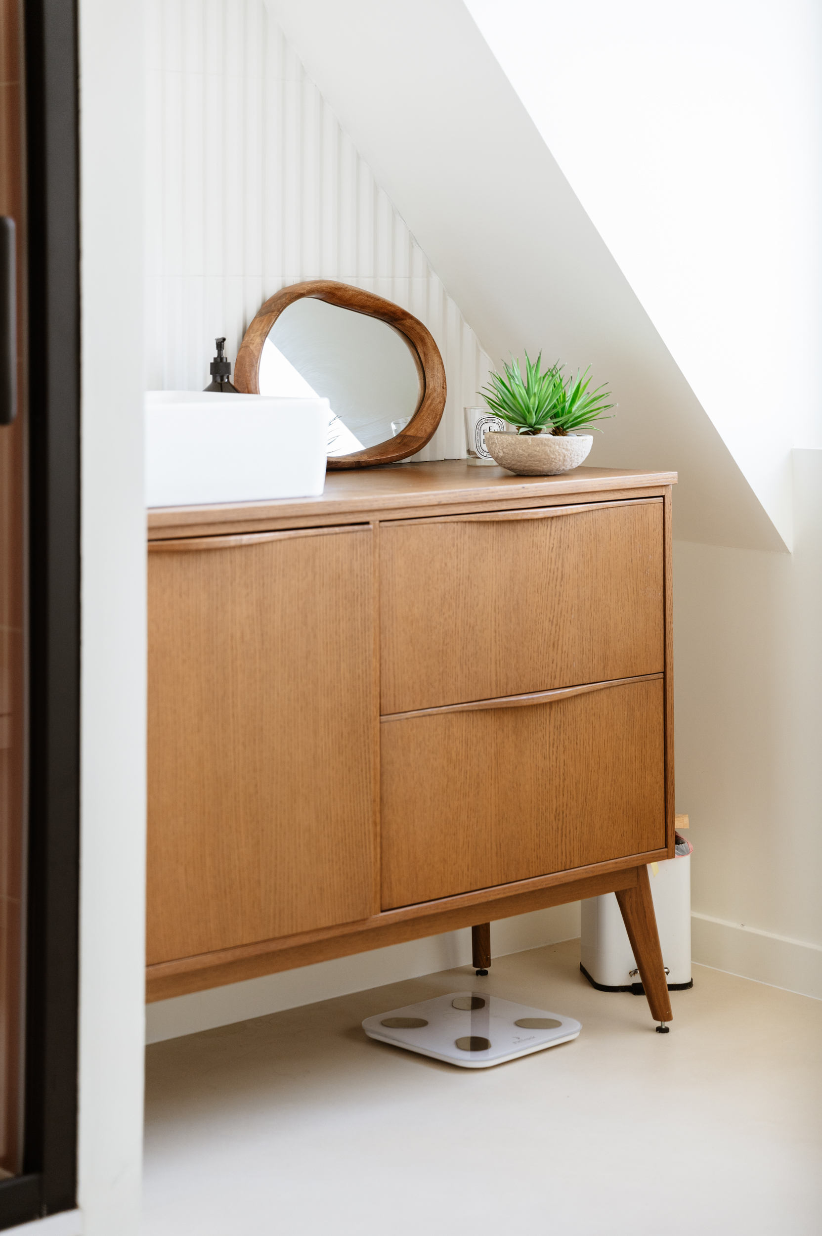 La salle de bain adopte une esthétique contemporaine et contrastée. Le sol en mortex, proche du béton ciré, offre une finition minérale élégante. Le meuble vasque rétro en bois, issu de Leroy Merlin, réchauffe l’ensemble. La robinetterie noire encastrée structure l’espace, tandis que la douche en carrelage terracotta et sa niche intégrée conjuguent design et fonctionnalité.