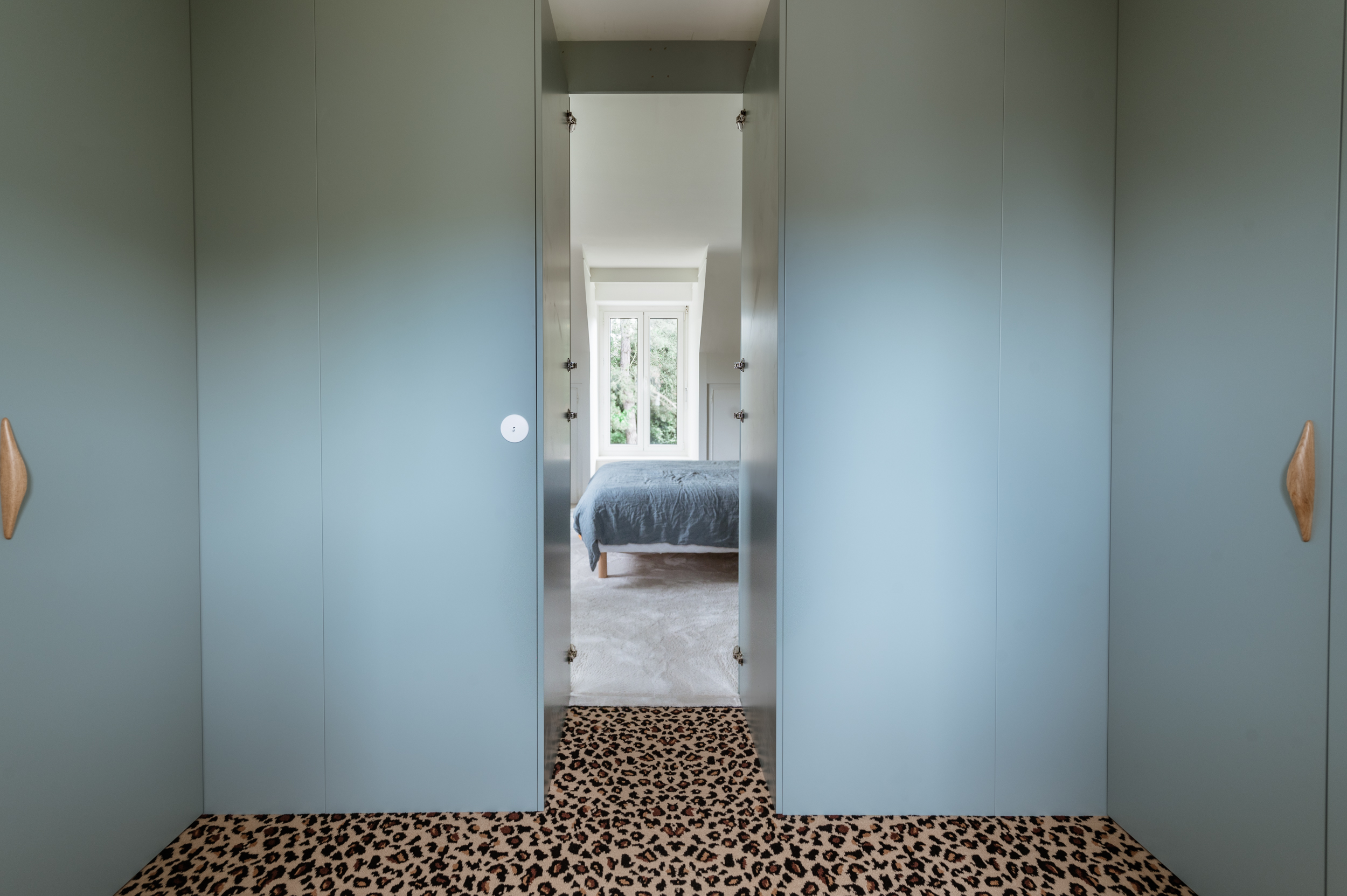 Le dressing a été conçu comme une pièce à part entière. Un linéaire d’armoires intègre une porte dérobée menant à un espace plus intime. L’aménagement repose sur une base Ikea, habillée de façades Bocklip bleu-gris, apportant élégance et caractère. Un tapis léopard vient souligner l’audace décorative de cet espace fonctionnel.