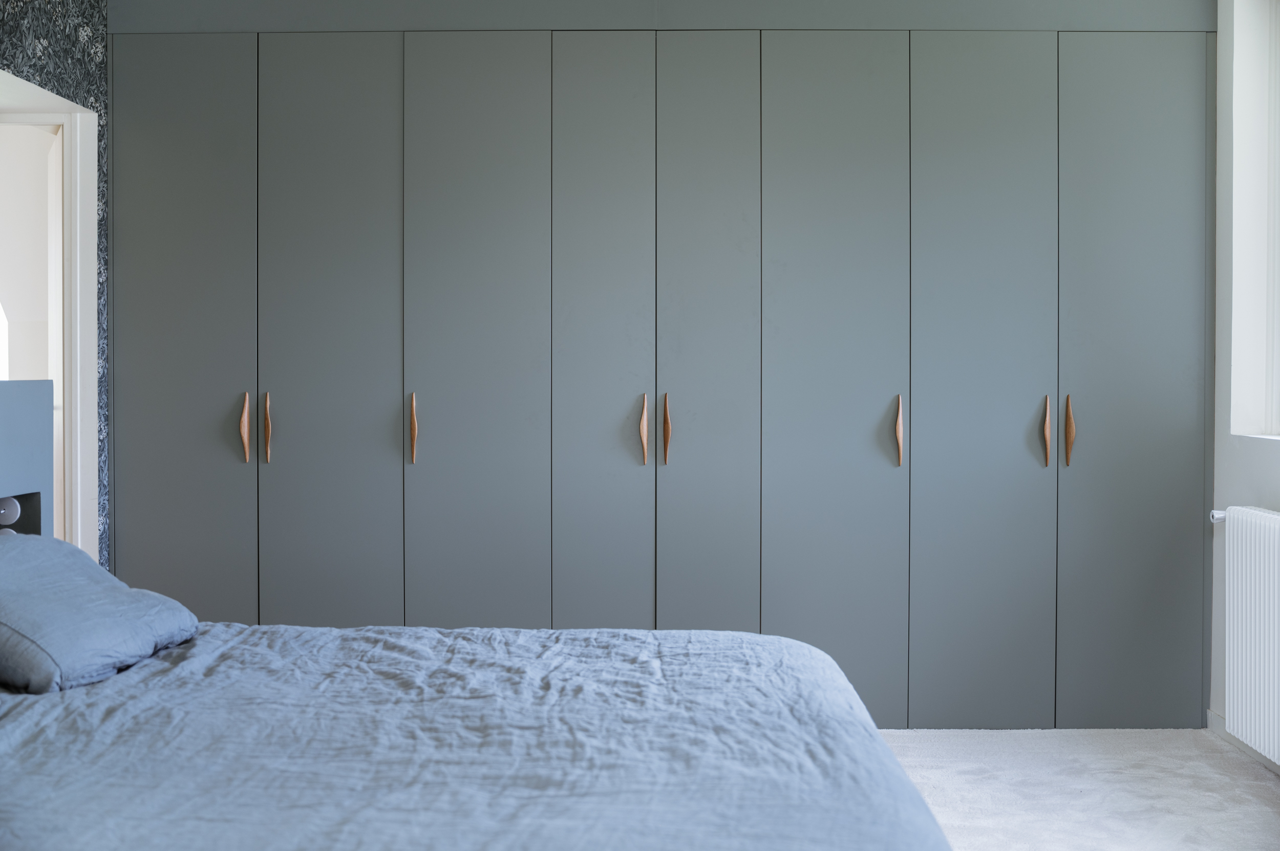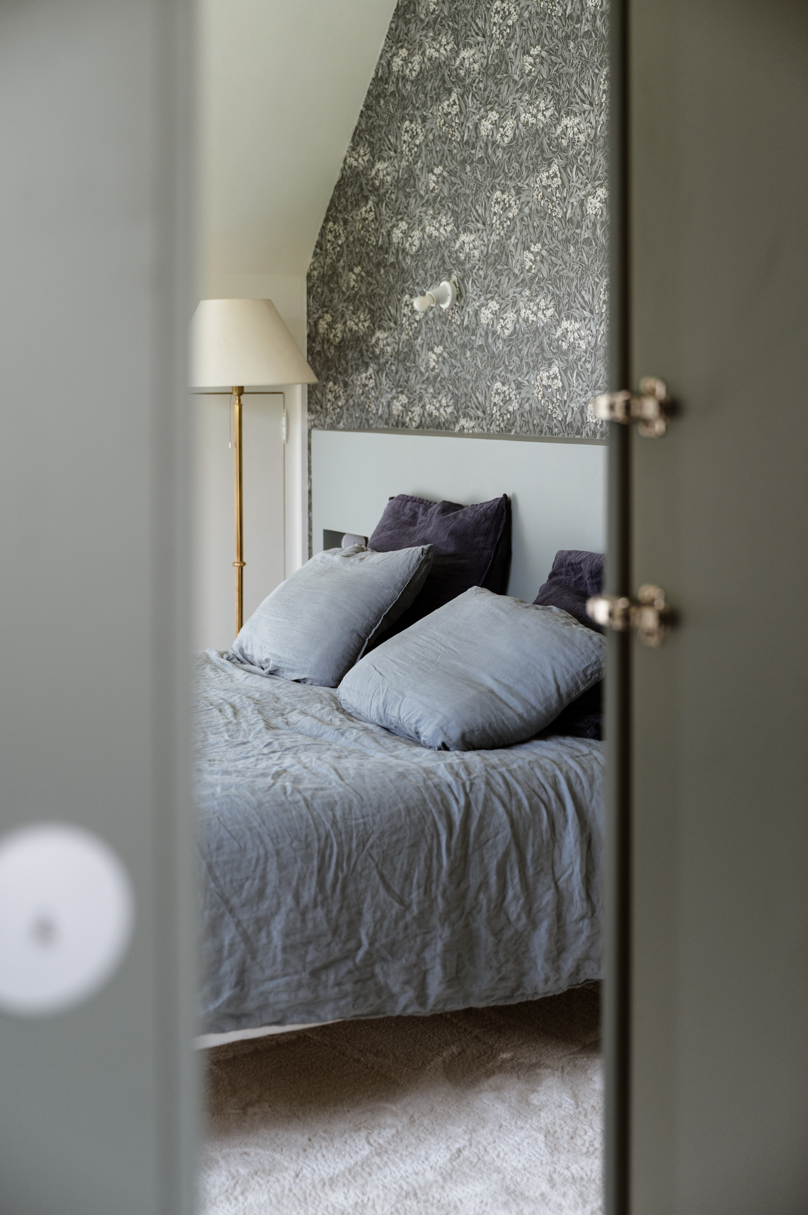 Dans la chambre, l’architecte d’intérieur à Marcq-en-Barœul a imaginé une tête de lit sur mesure, peinte dans le même bleu que le dressing afin de créer une continuité visuelle. Un papier peint fleuri anime le mur et apporte une touche raffinée, tandis que la parure de lit assortie renforce l’harmonie globale.