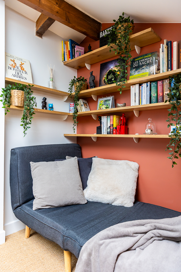 L’ancienne salle de bains, peu utilisée, a été réinventée en coin lecture et espace détente. Des bibliothèques sur mesure, une assise confortable et des couleurs enveloppantes invitent désormais à la relaxation. Ce nouvel agencement répond parfaitement aux envies de la cliente, tout en valorisant chaque mètre carré disponible.