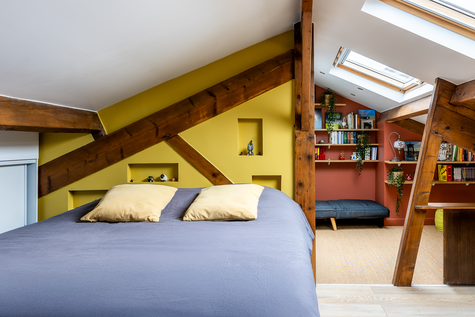 Le coin nuit a été repensé pour profiter au maximum de la lumière naturelle. Le lit, repositionné sous les fenêtres de toit, offre une atmosphère douce et reposante. Des niches intégrées à la tête de lit apportent du caractère tout en servant d’espaces de rangement. À proximité, un coin musique permet à la cliente de profiter de ses instruments dans un cadre chaleureux et personnalisé.