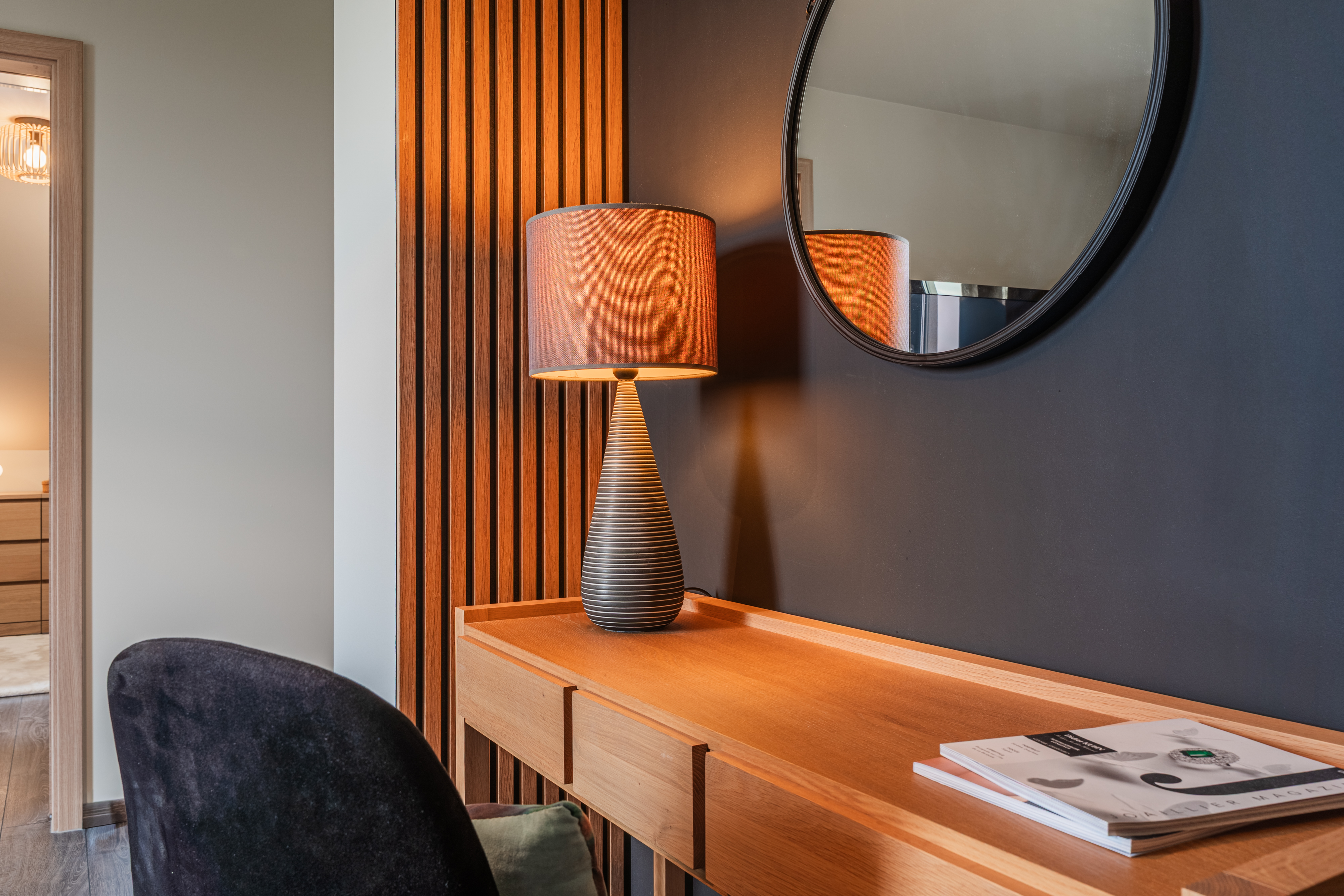 Le coin coiffeuse, souligné par des panneaux acoustiques en bois qui se prolongent du mur au plafond, offre une composition graphique et raffinée.