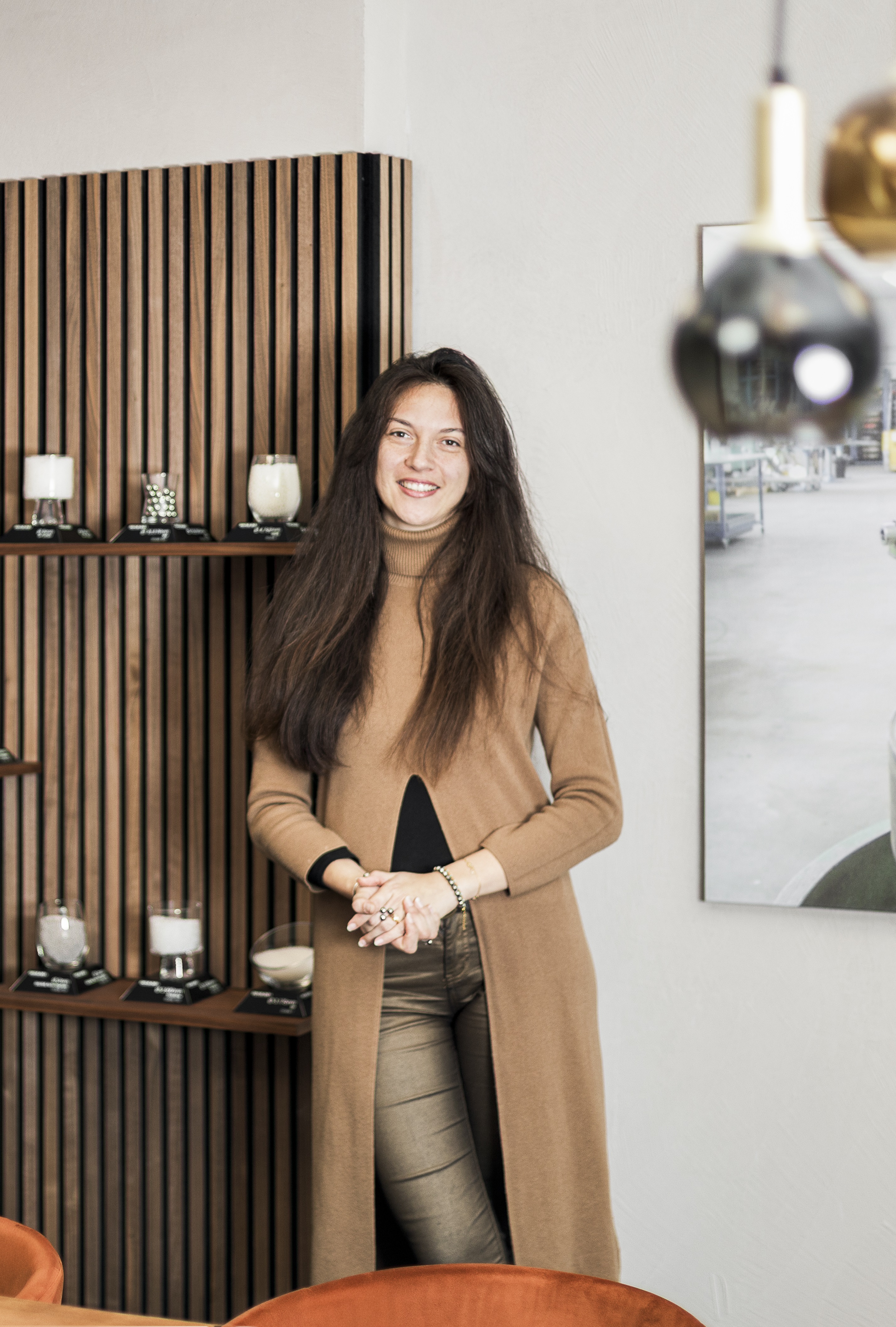 La cloison créée pour dissimuler les accès aux sanitaires a été peinte dans une teinte plus soutenue, créant un effet de profondeur tout en préservant l’intimité. Trois suspensions en verre ambré apportent une touche de douceur et de sophistication à l’ensemble.