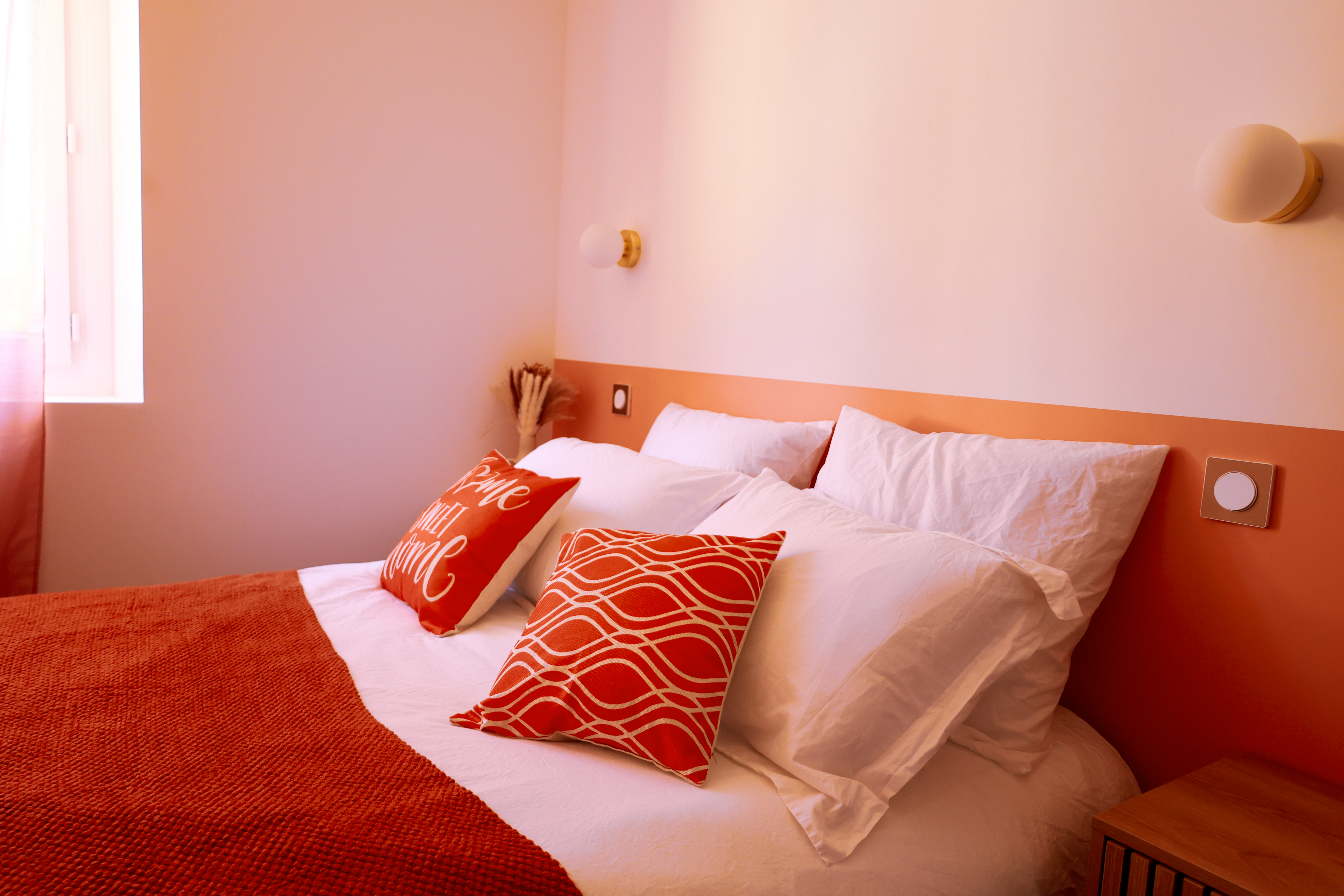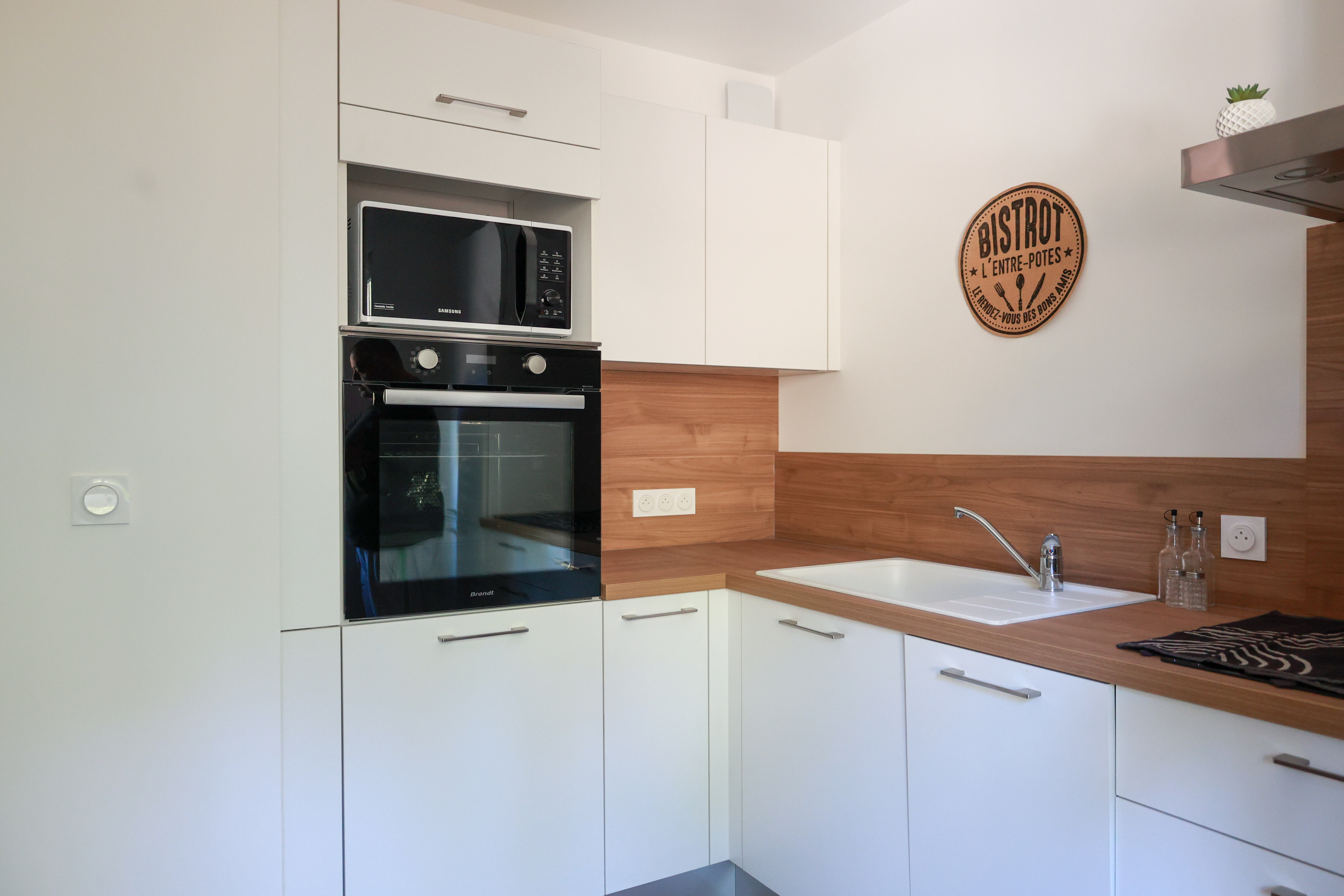 Le vocabulaire décoratif privilégie les matières naturelles et les teintes apaisantes. Les cuisines sur mesure, aux lignes épurées, s’intègrent avec fluidité dans un ensemble blanc et bois clair. Les chambres sont mises en scène avec sobriété : literie en 140, éclairage mural d’ambiance, menuiseries revisites et déclinaison de blancs chauds pour une atmosphère sereine et sophistiquée.