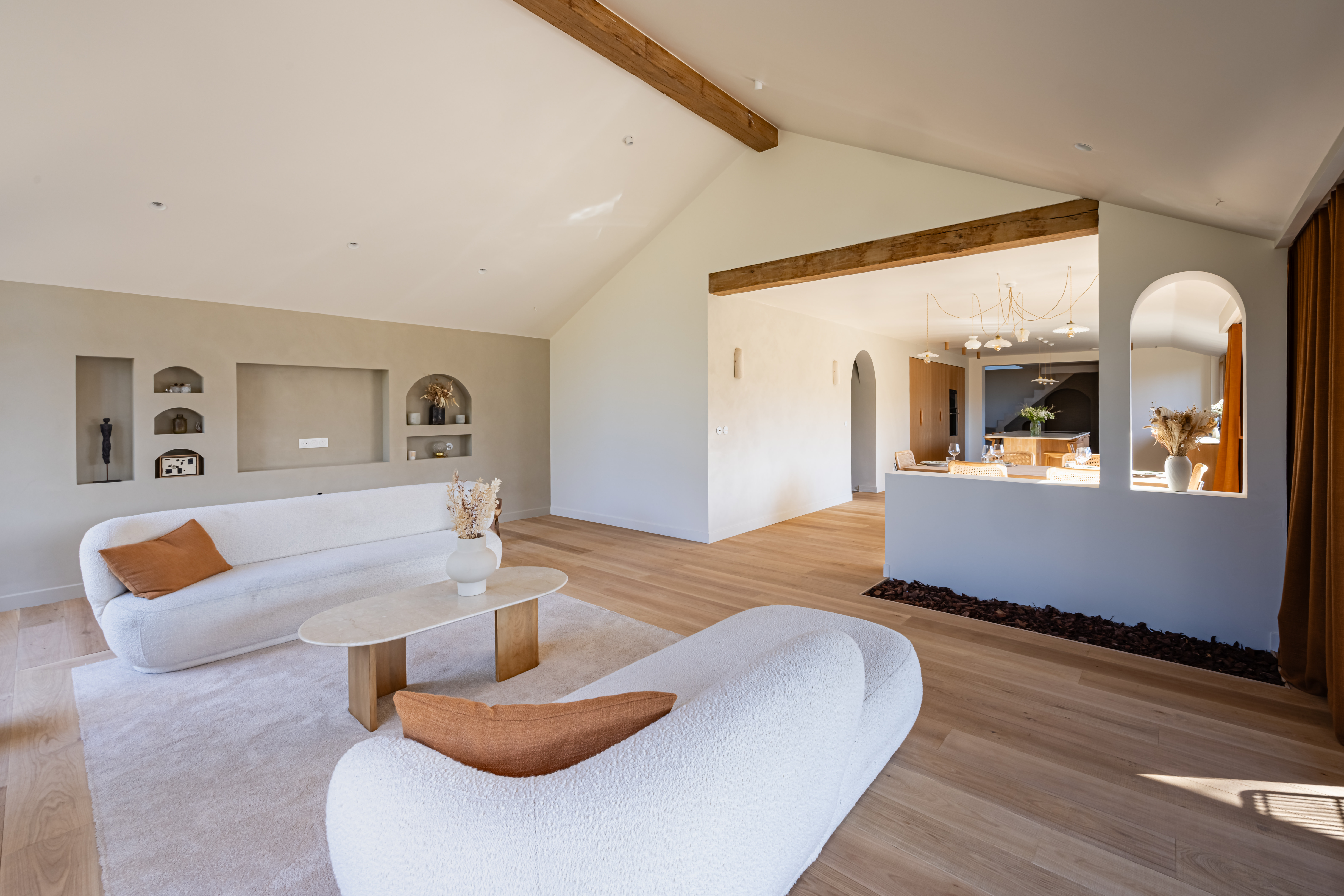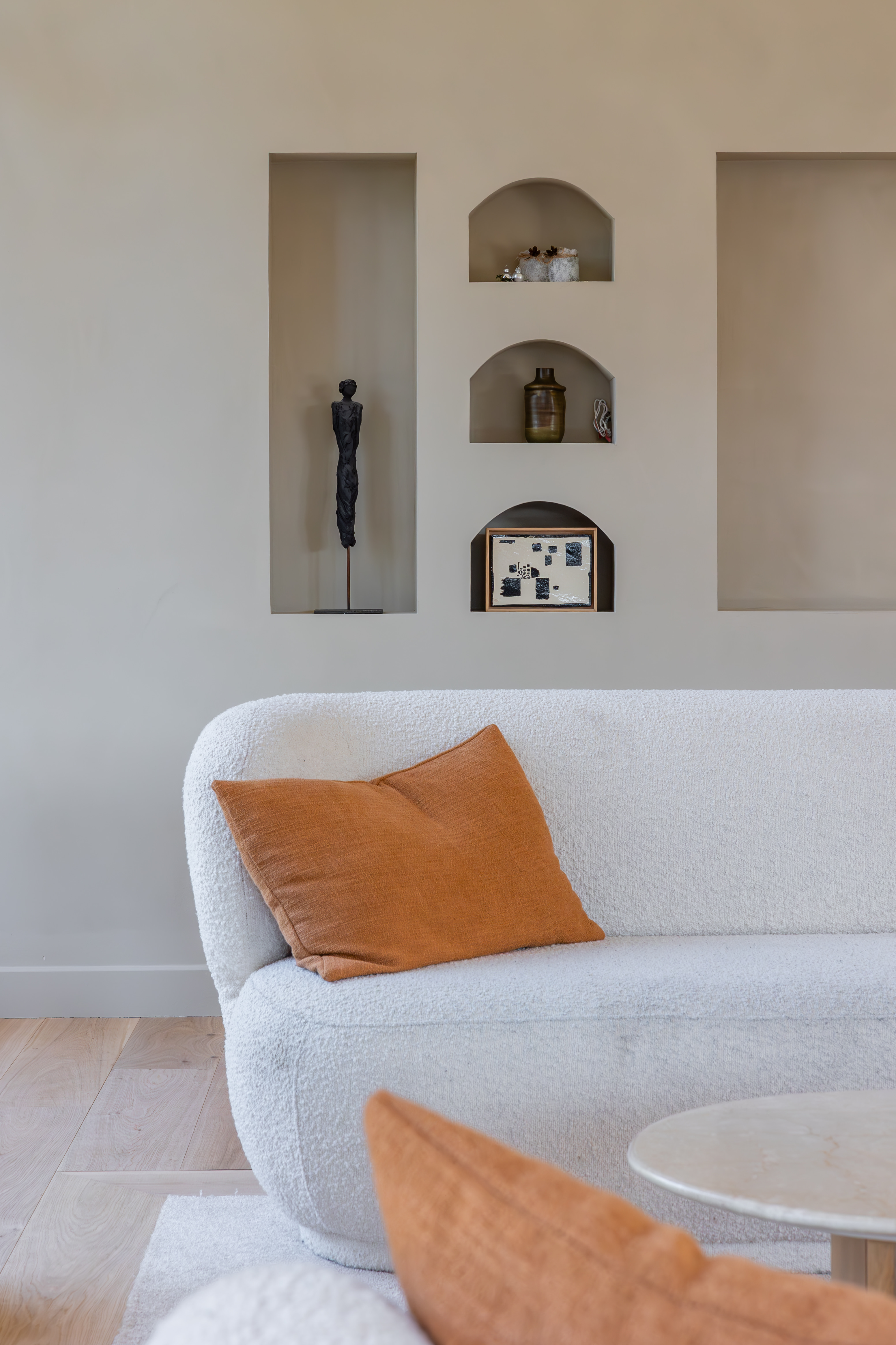 Arches, alcôves et menuiseries en bois rythment les volumes et donnent une véritable personnalité aux lieux. Un tapis incrusté dans le parquet crée une zone de confort dans le séjour, tandis que le sol en bejmat dans la salle à manger capte la lumière et renforce l’identité chaleureuse de la maison.