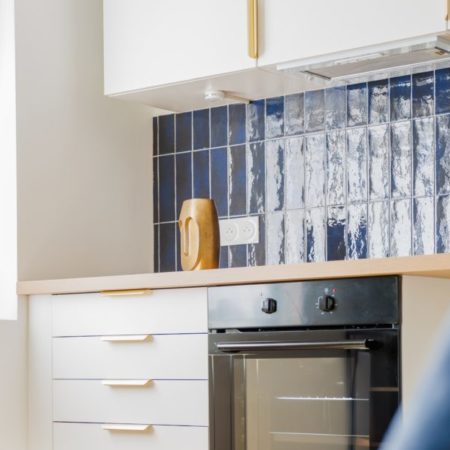 Côté ambiance, Mareva a joué avec les matières et les couleurs, comme l’illustre particulièrement le plan de travail imprimé terrazzo. On remarque également les carreaux de faïence effet zellige beige. Ils contrastent harmonieusement avec les éléments de mobilier bleus, qui font eux-mêmes écho avec le mur donnant sur le salon.