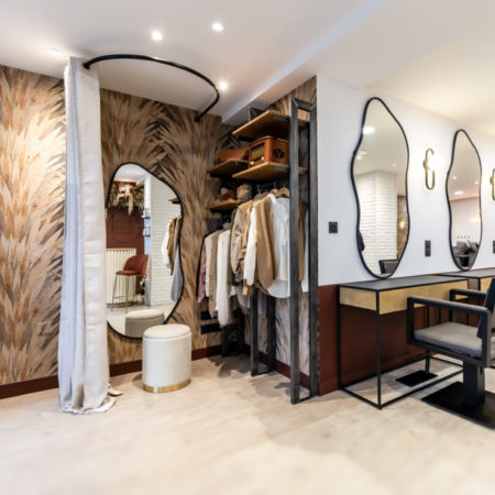 L’espace accueil – vente est équipé d’un comptoir réalisé sur-mesure et d’un mobilier de présentation des produits avec bardage mural bois à claire-voie. Un module mobile de rangement sur roulettes complète l’ensemble, par ailleurs éclairé par deux suspensions majestueuses en métal doré (Maisons du Monde).