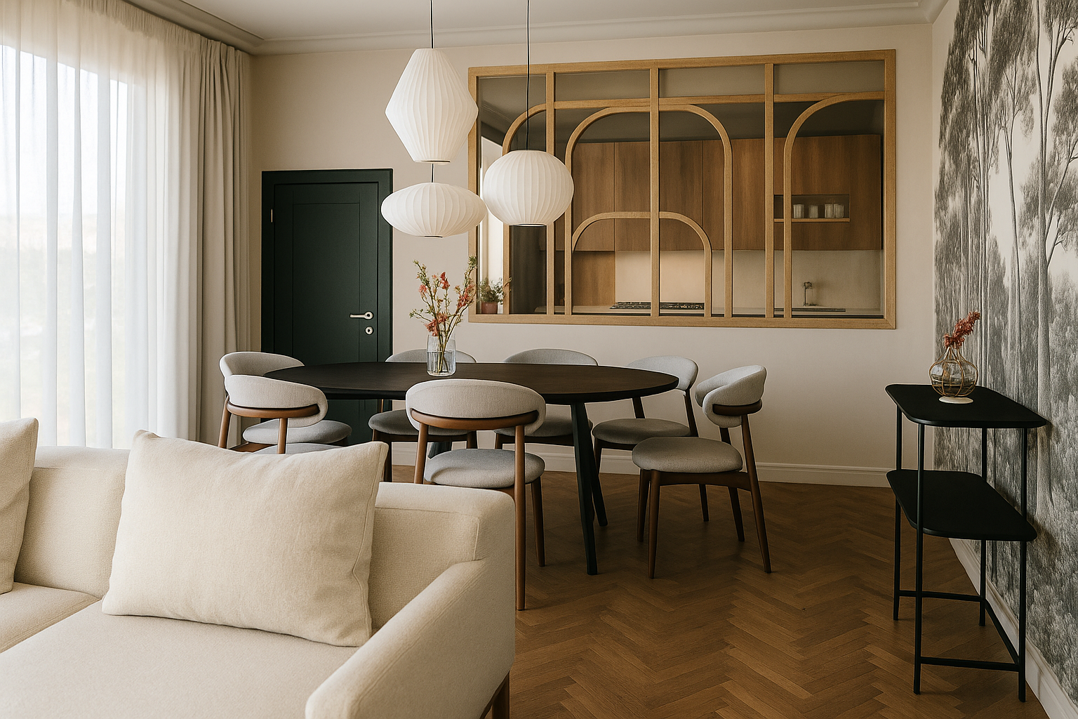 Le choix des meubles joue un rôle crucial dans l’élégance de cet intérieur. Les courbes prononcées de la table à manger, des lustres et des chaises apportent une touche d’élégance distincte, tout en dynamisant à l’ensemble.