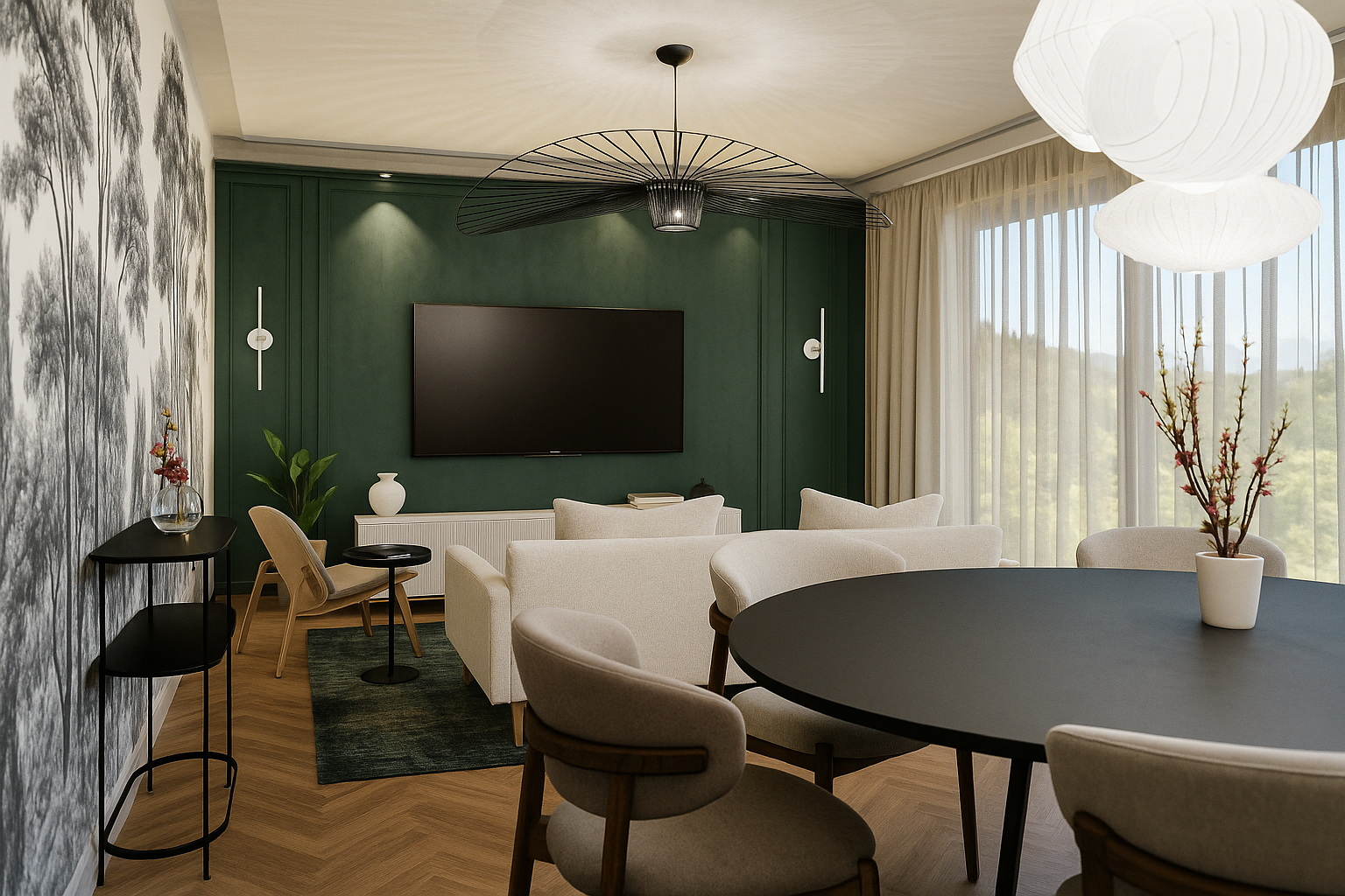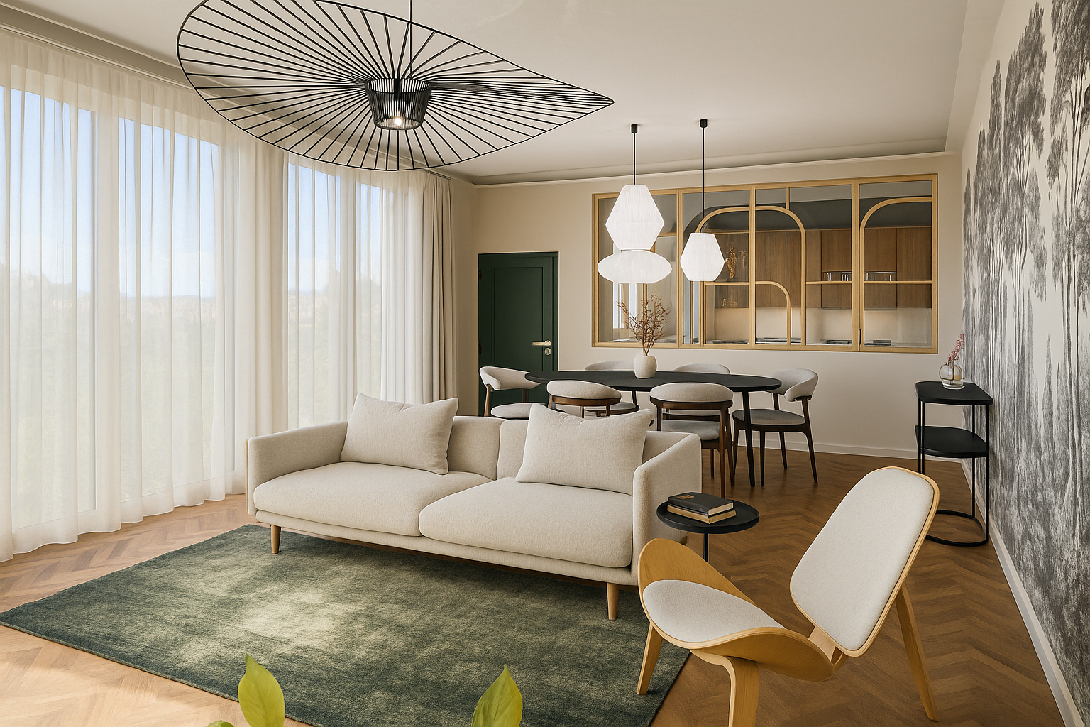 Le clou du spectacle dans ce salon rénové est sans doute le choix d’un papier peint panoramique aux motifs de forêts et d’arbres abstraits. Ce choix audacieux transforme un mur entier en une œuvre d’art captivante. Il invite parallèlement la nature dans l’appartement, au profit d’une atmosphère sereine et apaisante.